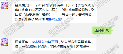 【答题格式为da+答案(da不区分大小写),例如答案是爱消除,则回复“da爱消除”答题】
