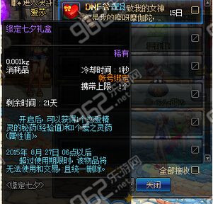 [乐游网导读]DNF缘定七夕活动上线,玩家们只需要在活动期间登录游戏便可以获得七夕礼盒,相信玩家们对七夕礼盒中的奖励非常期待,下面就是小编为大家带来的内容介绍!