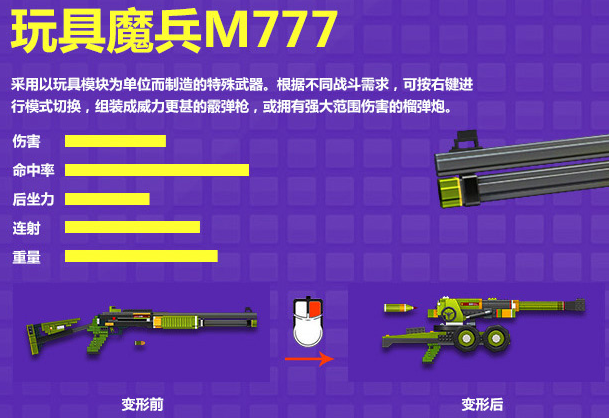 玩具魔兵M777是一款全新宝箱武器将与你见面。以XM1014自动霰弹枪为原型,通过改造获得的拥有变身能力的全新范围型高伤害武器。新武器可以根据不同战斗需求,按右键进行模式切换,组装成发射8发子弹的霰弹枪,或拥有强大范围伤害的榴弹炮。