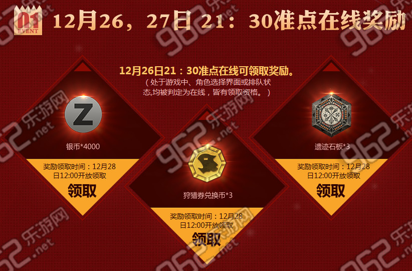 [乐游网导读]怪物猎人OL最近公布了新的准点在线活动,12月26日和27日准带你在线可以获得非常丰厚的奖励,运气好的话可以获得不错的实物奖励,下面是准点在线活动内容及奖励领取地址分享。