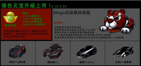 跑跑卡丁车新活动来袭,绿色元宝升级,在线即送豪礼,活动时间5月15日到5月29日,玩家们在竞速赛中将随机获得元宝,通过升级赛车有机会获得更多奖品。