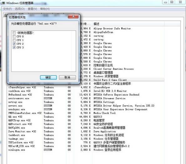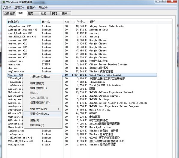 2.Ctrl+Alt+Del呼出任务管理器,找到其中的GW2.exe,点击右键并选择下图中的选项;