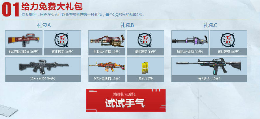 活动期间,用户在页面可以免费随机获得一种礼包,每个QQ号只能领取1次。