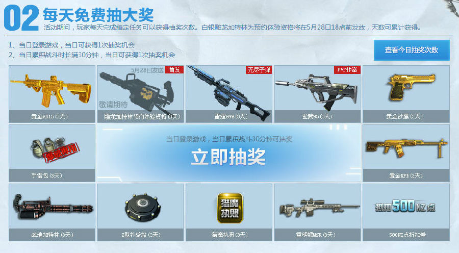 活动期间,玩家每天完成指定任务可以获得抽奖次数。白银雕龙加特林为预约体验资格将在5月28日18点前发放,天数可累计获得。
