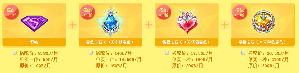 豪华紫钻、贵族宝石(31天车队贵族)、情侣宝石(31天情侣贵族)、皇权宝石(31天皇族贵族)