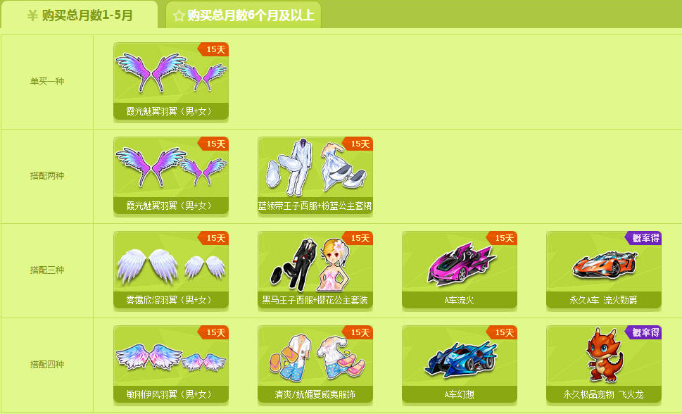 敏刚伊风羽翼(男+女)15天、清爽/妩媚夏威夷服饰15天、A车幻想15天、概率得:永久极品宠物飞火龙