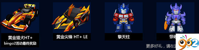 黄金尖锋 HT+ LE、擎天柱、惊破天等顶级赛车和道具等你开启,更有bingo2活动最终奖励黄金猎犬HT+