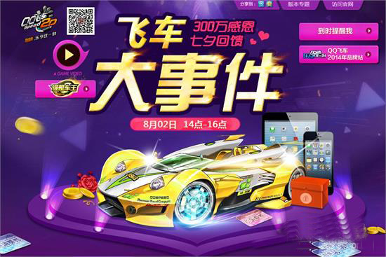 QQ飞车4014年8月2号七夕活动,玩家可以整点等待官方在线送大礼活动,赢得永久绝版A车以及苹果手机等实物大奖,机会不容错过,在2014/8/2,准时14点—16点,在线即有机会可领取海量大礼包礼包和电子产品等实物奖品,上万辆A车以及S车等你拿。