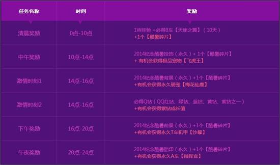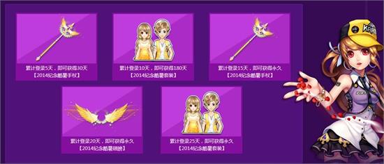 整点在线,即可分别获得10天2014纪念A车【酷暑】+3天K2轮滑【黄金铠甲】(男)、魔幻公主(女)。