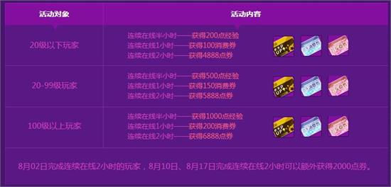 全天无时无刻都有奖励8月2日登录游戏,在任务面板寻找【暑期嘉年华】任务,全天不同时间段都可以领取不同的奖励。
