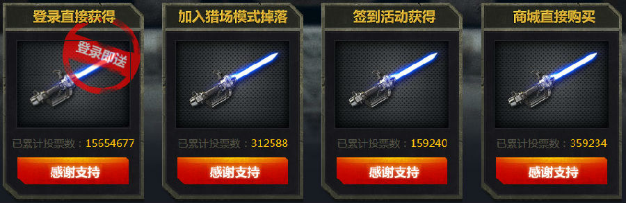 你的武器由你做主!“登录直接获得”的方式成为最终投票数最高的选项将成为最新最酷近战武器"逆光之刃"的获得方式!