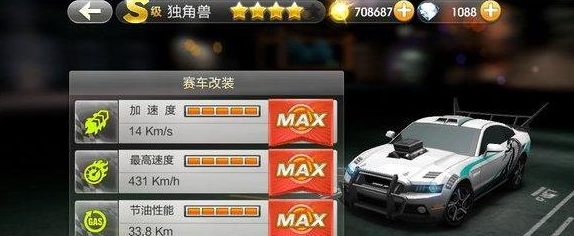 独角兽初始状态为B级赛车,改装至满级S级独角兽后最高速度可达431km/h,加速度14km/s,节油性能33.8km。对比同为初始状态B级赛车 的英朗XT,锐风,哥斯特,北极光等独角兽可谓是独领风骚,处于绝对的霸者地位,至于跟原生A级S级的赛车,那就没法比了。
