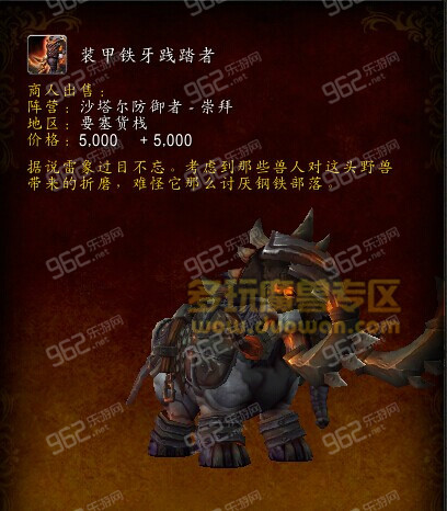[乐游网导读]在魔兽世界6.0版本“德拉诺之王”中玩家们又将为新的势力而奋斗,接下来我们将为玩友们分享目前已经确认可以获得的声望坐骑资料,希望你会喜欢。
