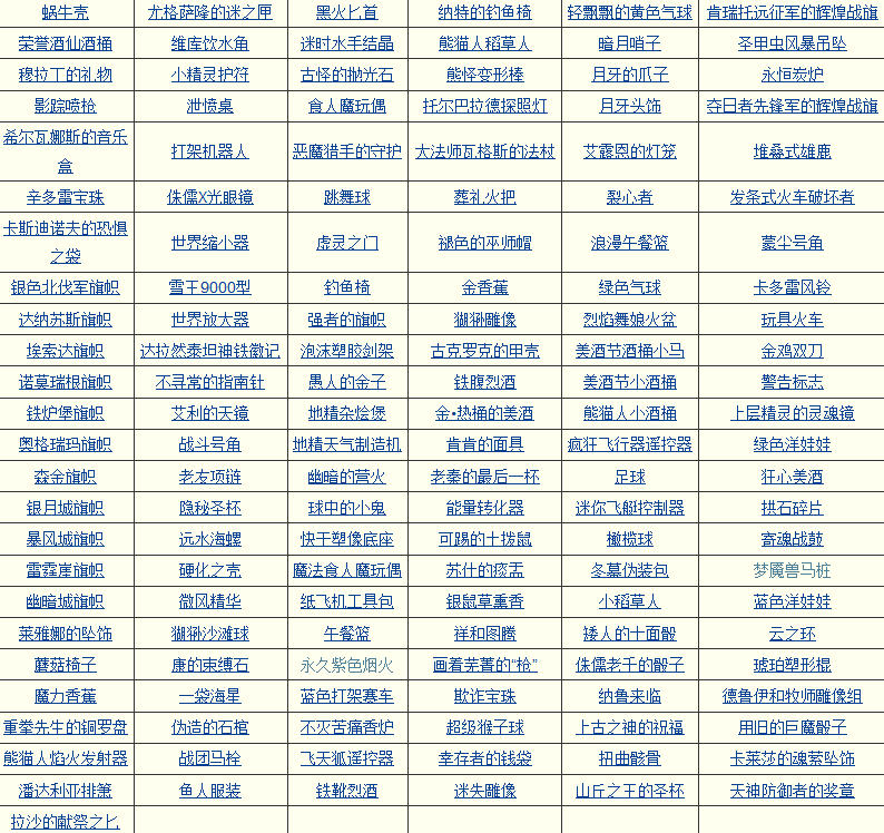 以下物品来自于商人贩售,只要有闪闪发光的金币或是一些其他的代币,这些商人会很乐意将这些有趣的小玩意儿卖给你,例如各大主城玩具商所贩售的玩具火车或是永恒岛古兰所出售的不灭苦痛香炉等。