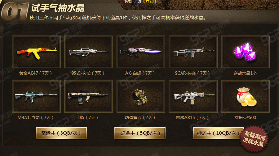 2. 支付3QB、5QB、10QB,均可获得随机武器1个,金额越高,价值越高,其中10QB可高概率得逆战水晶;