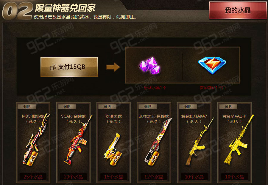 3. 支付15QB可得1个逆战水晶+1个月豪华蓝钻;使用指定数量逆战水晶可兑换所需武器,数量有限,兑完即止;