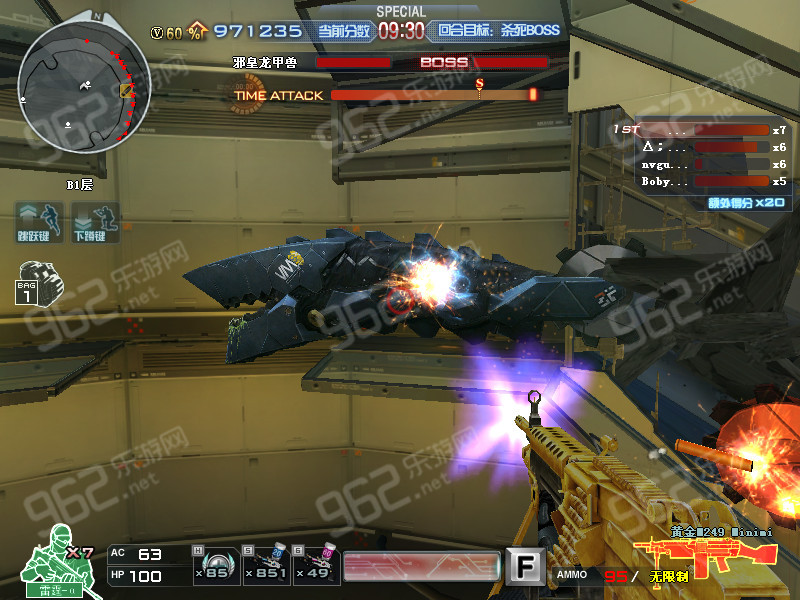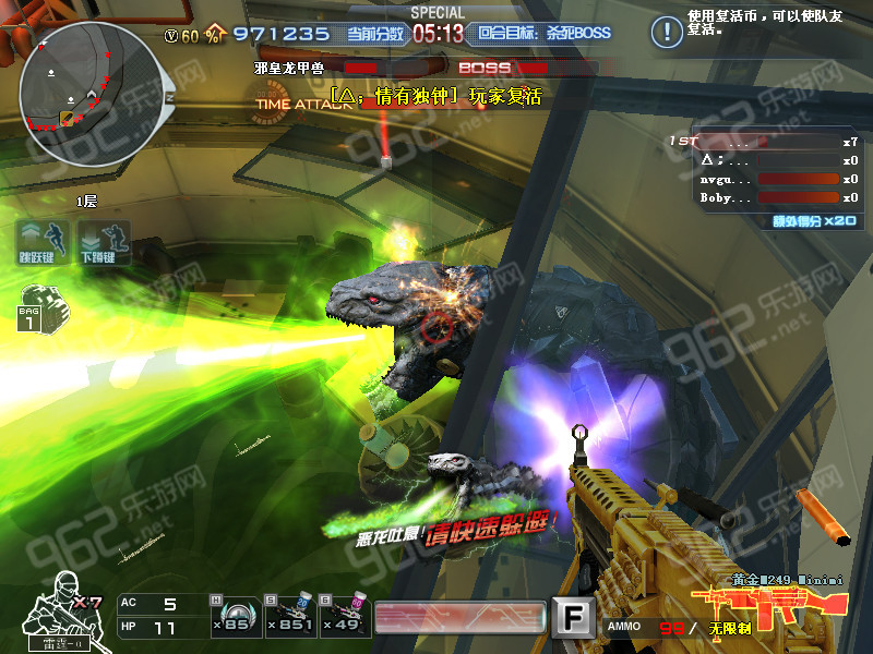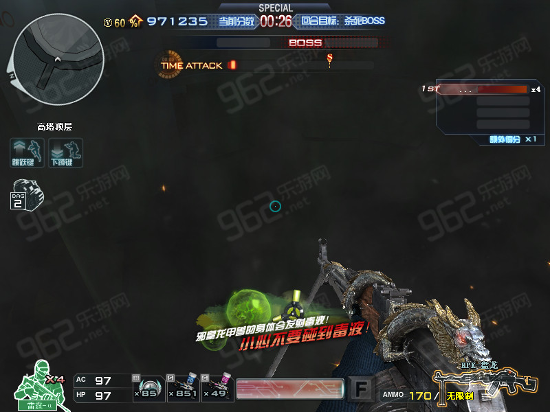 先打邪皇龙甲兽分为三个阶段,第一阶段boss不会放毒泡泡,也不会发射激光,所以开始我们用枪和榴弹枪一直打boss头部即可直到boss打下去。如图: