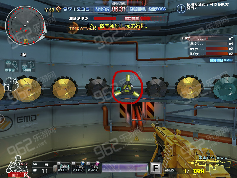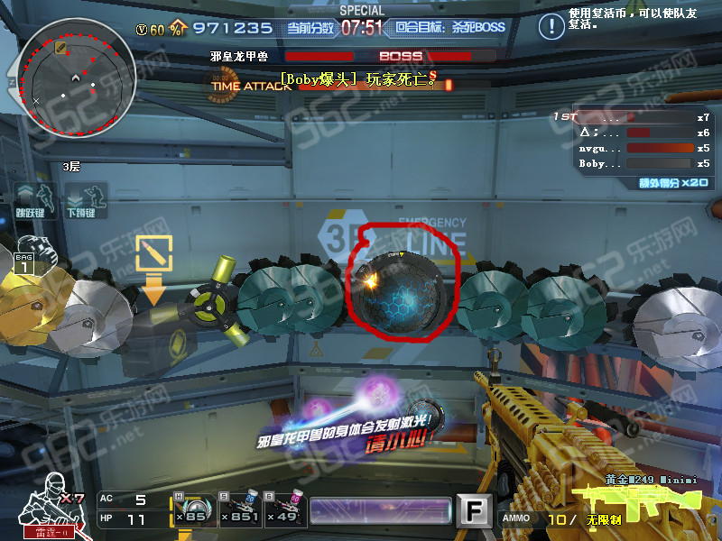 第二阶段boss就开始发射激光和放毒液了,所以我们要找到图上画红圈圈的两种车轮都打掉就可以了,那万一打不掉,发射激光我们就躲在邪皇龙甲兽上面那一层贴边就好,泡泡用枪打破就行了